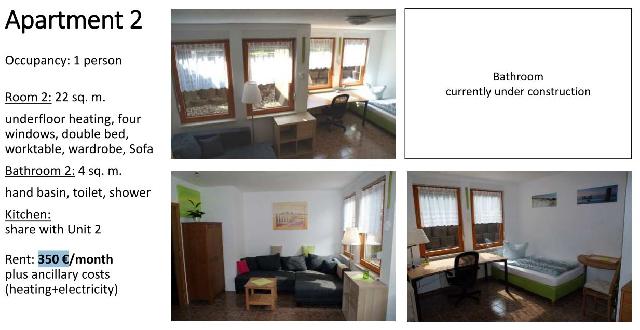 We are offering a fully furnished student apartment (No.2) in Berlin Wilhelmshagen.The single room with own bathroom is located in the Souterrain floor of our family house. Only the kitchen is shared with student apartment No.1. The house is located in the green belt of Berlin, not far from lake M?ggelsee.All other details can be found on the attached pictures.If you are interested send an email to booking@mrvision.org.